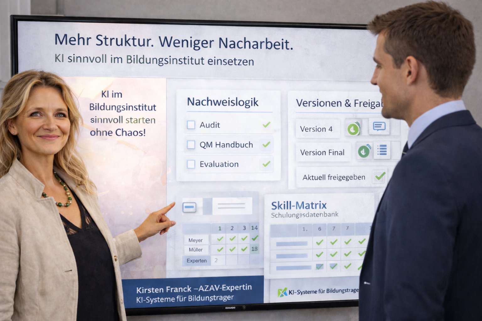 AZAV mit KI ist der Kurs für Bildungsträger, die einen verlässlichen Zertifizierungsprozess brauchen. Du lernst klare Verantwortlichkeiten, saubere Abläufe und nachvollziehbare Nachweise. So bist du im Audit vorbereitet und zeigst statt zu erklären.